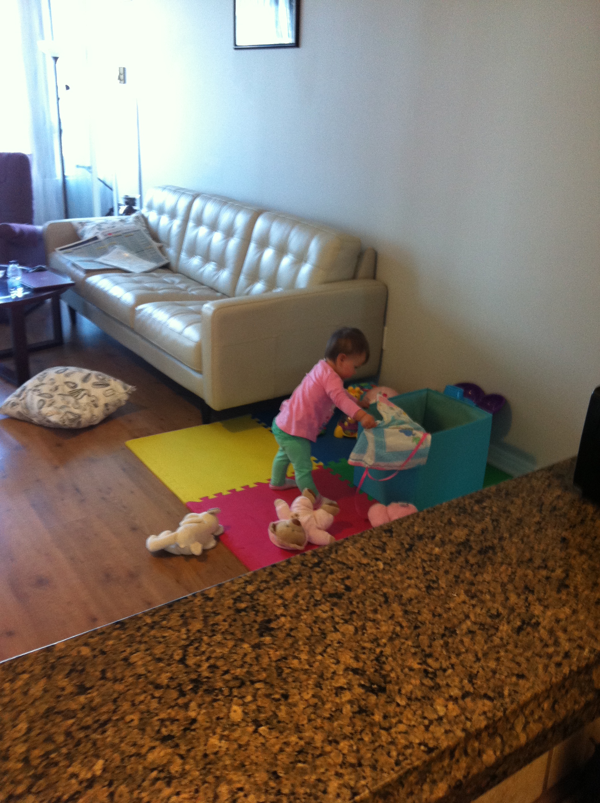 Second, living in a condo actually was a blessing for the first few months. A small space also means that you don’t have to clean a lot and that everything you need is easily within reach. The truth is that you don’t really need a lot of space when you are sitting all day on your couch and breastfeeding. We planned to stay in our one bedroom condo until our LO turned six months old and then move out during the summer. However, when Emily was three months old the condo that we were living in was sold and we had to move out. We moved to a two-bedroom condo that also had a den. It was 11,000 square feet which were very spacious compared to what we were used to.